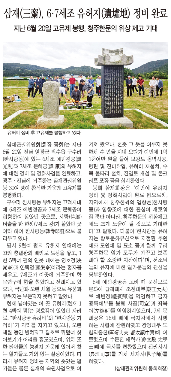 삼재(三齋), 6·7세조 유허지(遺墟地) 정비 완료