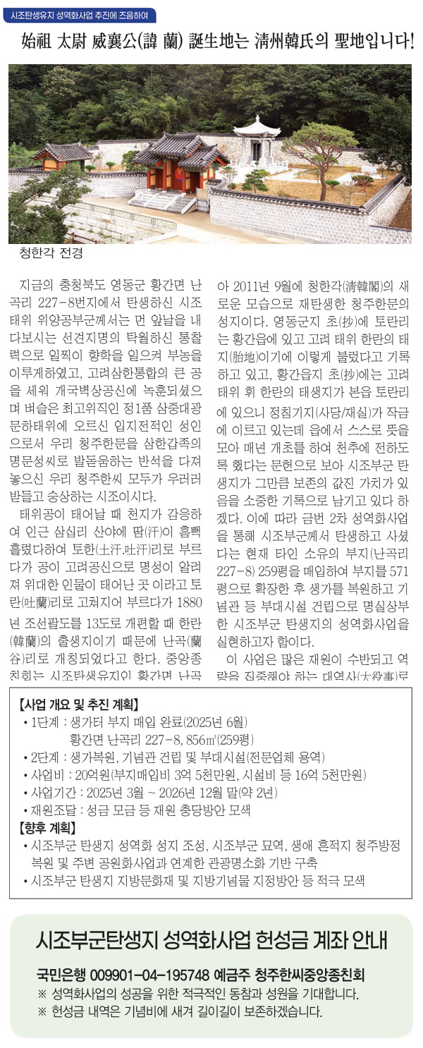 始祖 太尉 威襄公(諱 蘭) 誕生地는 淸州韓氏의 聖地입니다!