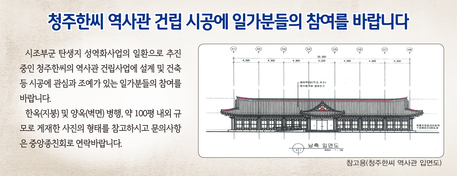 청주한씨 역사관 건립 시공에 일가분들의 참여를 바랍니다.